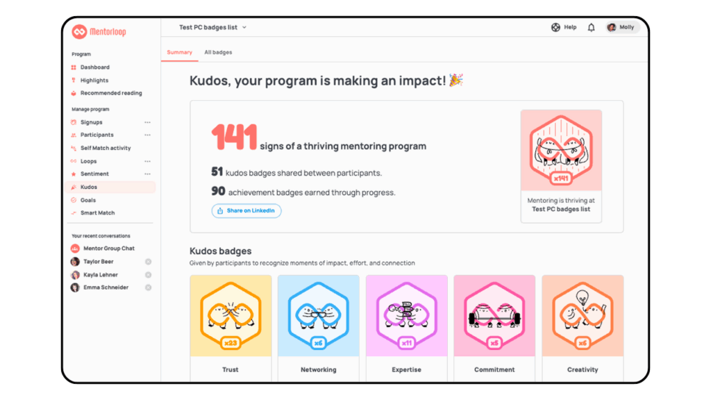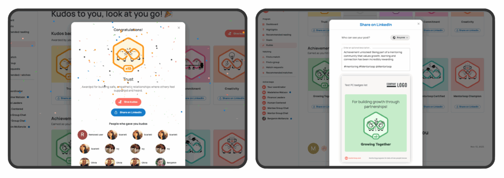 Badges appear on participant profiles and can be shared (loudly and proudly!) on LinkedIn. Since launching, mentors and mentees in Mentorloop powered programs have already been awarded 50,000+ badges, creating a thriving culture of recognition and amplifying mentoring success stories, and all without adding any extra admin to your plate.
