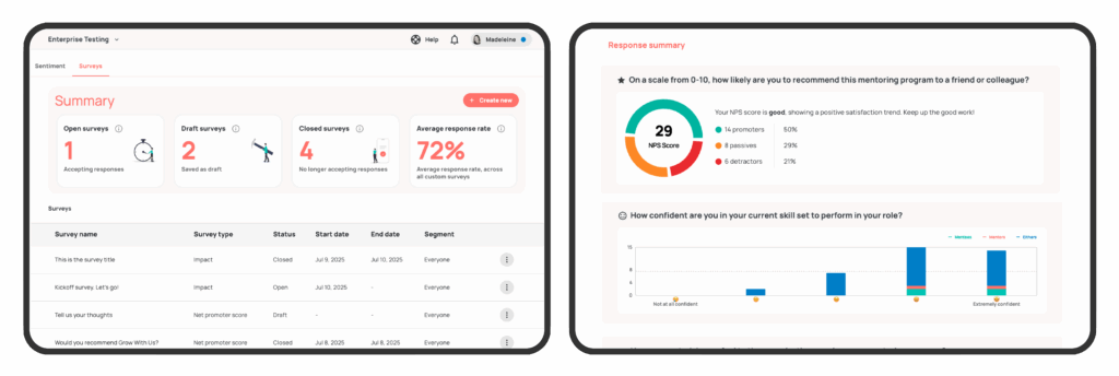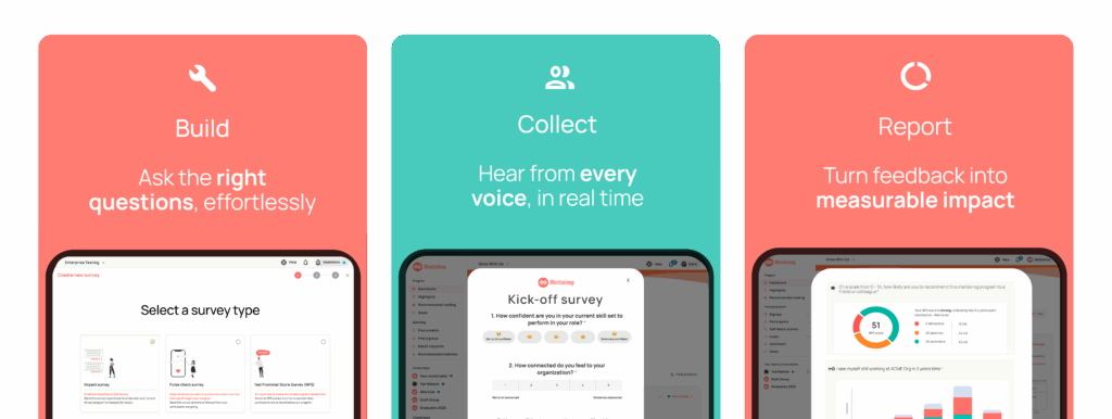 You can now create customised surveys to collect feedback from mentors and mentees at any point in the program journey. Choose from ready-made templates or mix and match from a curated bank of questions to measure satisfaction, track progress, and understand real impact.